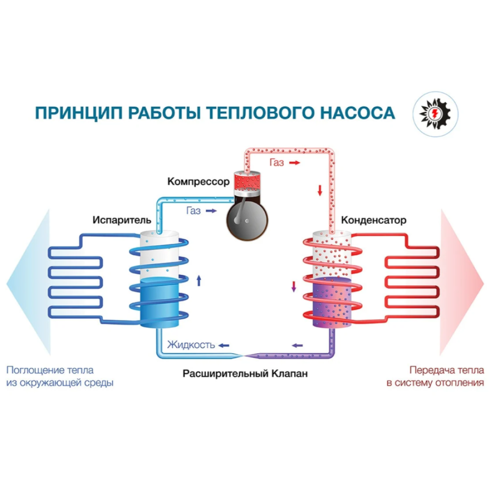 - Для получения тепла, тепловой насос использует электричество.