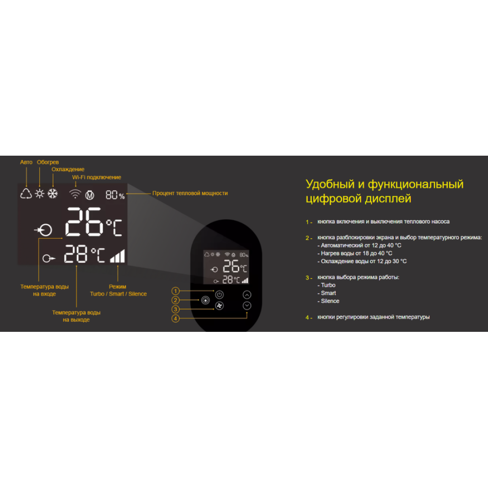 | t производимой воды на нагрев, С+12...+40 | t производимой воды на холод, С+30...+12 | Wi-FiДа |