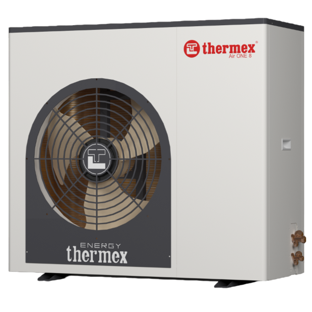Тепловой насос Thermex Energy (Термекс Энерджи) Air ONE 8 рассчитан на обслуживание дома площадью 100 квадратных метров. Устройство оснащено спиральным компрессором и отличается высоким уровнем надежности. В стандартный комплект входит встроенный циркуляционный насос и трехходовой клапан.
